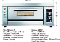 No. of Decks : 1, No. of Trays : 1 (Each Deck), Tray Size : 40X60 cm, Dimension : 131x85x66 cm, Chamber : 87x66x18.5 cm, Phase : Singgle, Voltage : 220V, Power : 0.075kW, Temp. : 25-350 ° C, Chamber : Heavy Duty, Operation Type : Gas, Control Cooking Time : 7-8 Min (Pizza), Plug Type : Indian